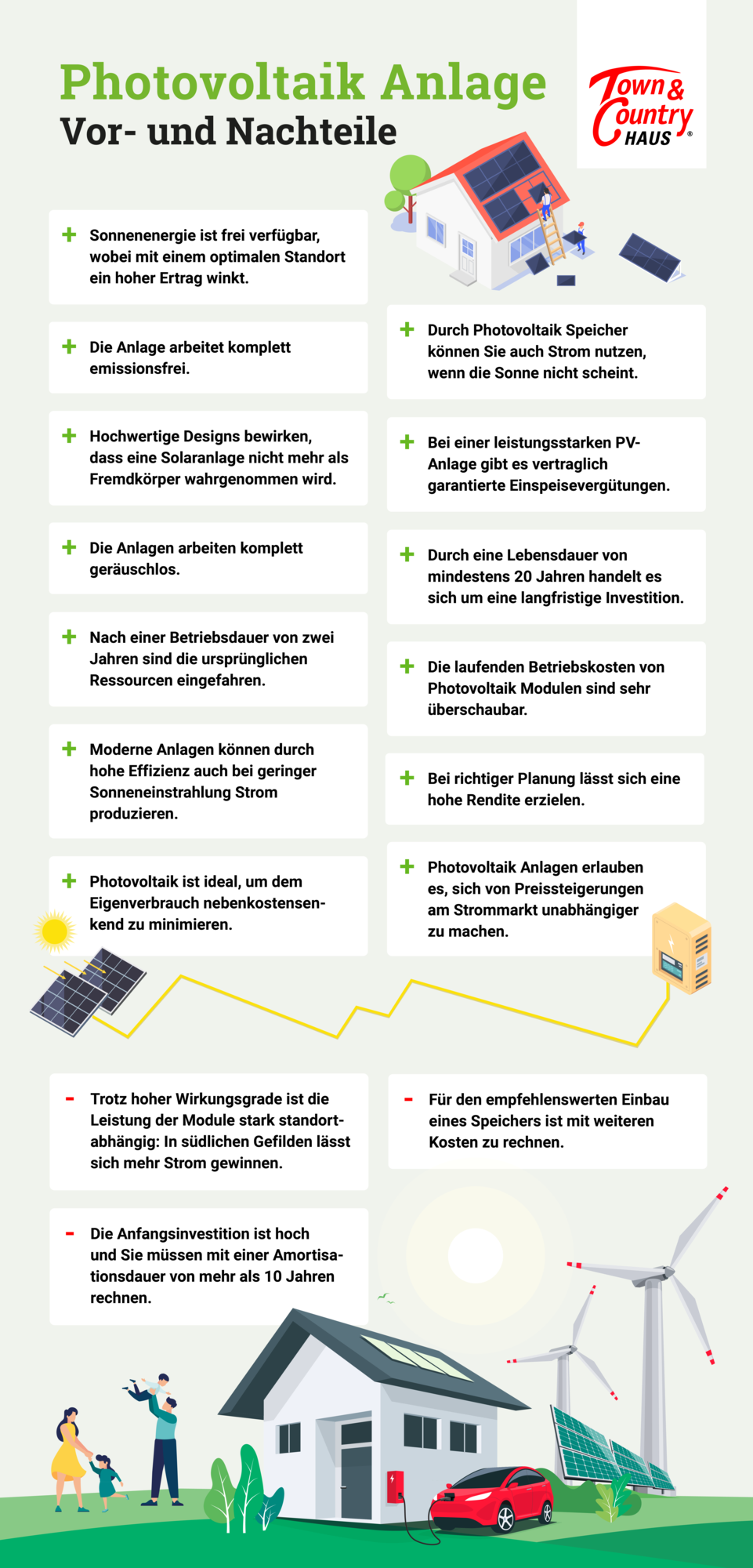 Bei den Nachteilen wiegt vor allem der Standort als limitierender Faktor schwer. Daher ist bei der Ausrichtung und Dimensionierung sehr genau auf diesen Aspekt zu achten. Es muss klar sein, mit welcher durchschnittlichen Sonneneinstrahlung an diesem Standort zu rechnen ist. Allein angesichts des deutlichen Übergewichts der Vorteile ist Photovoltaik in den allermeisten Fällen eine lohnenswerte Investition. Mit einer professionellen Beratung legen Sie die Basis für eine Zukunft, in der Sie sich über die scheinende Sonne auch mit Blick auf die Stromrechnung freuen werden. Lassen Sie sich ausführlich von Ihrem regionalen Town & Country Partner beraten, wenn Sie ein Niedrigenergiehaus planen wollen. Bedenken Sie, dass den zusätzlichen Kosten, die für Photovoltaik Module anfallen, attraktive Fördermittel gegenüberstehen.